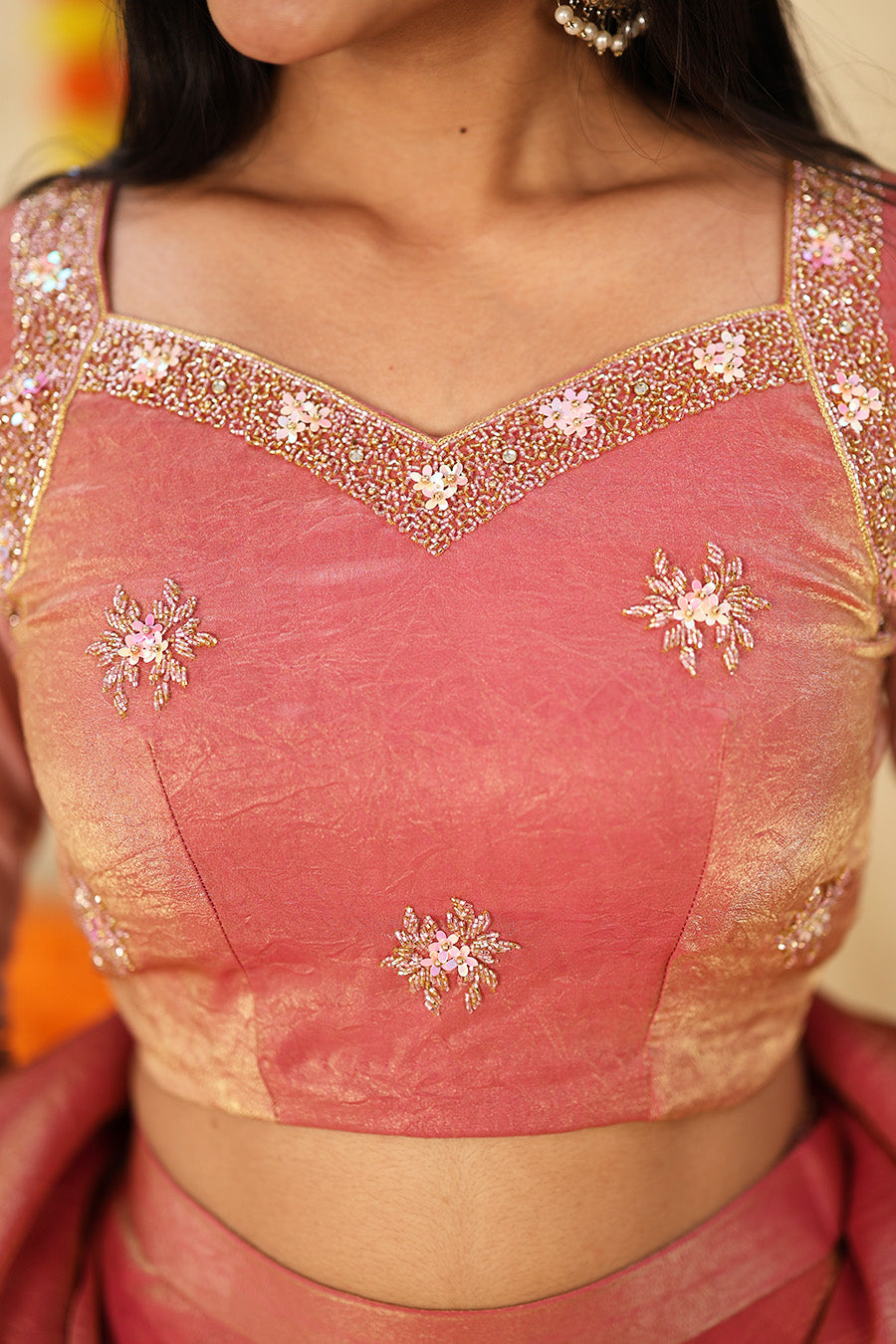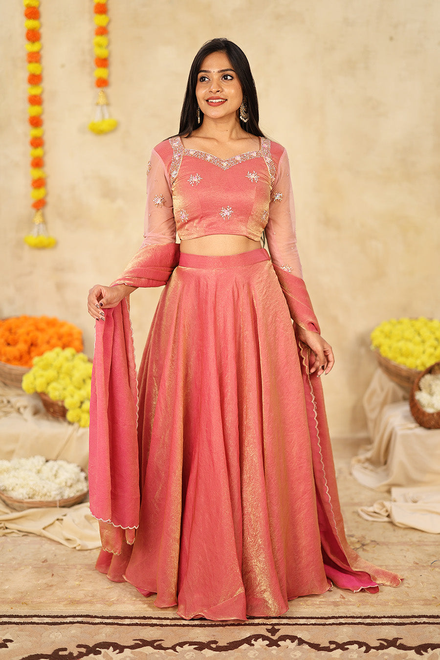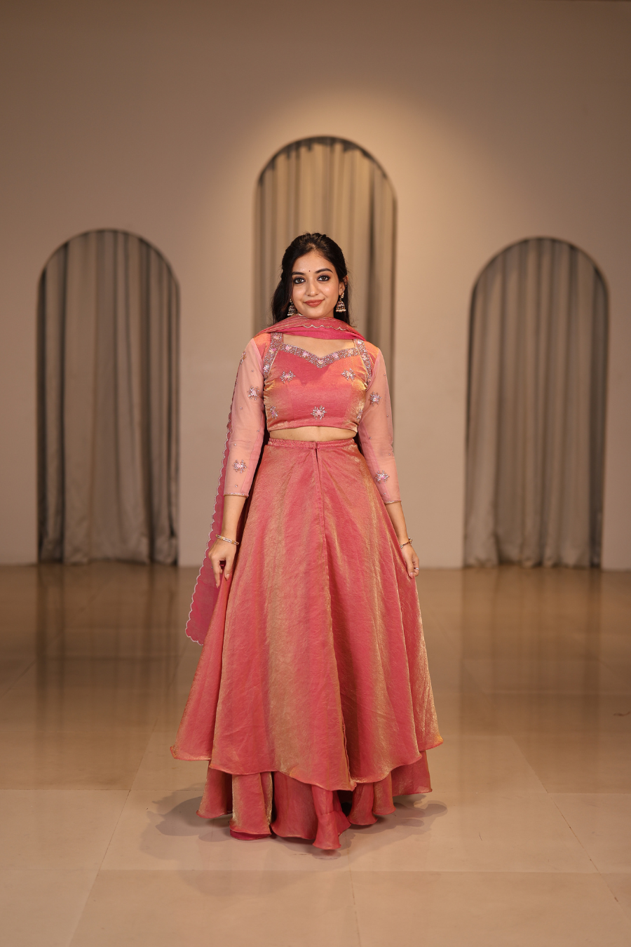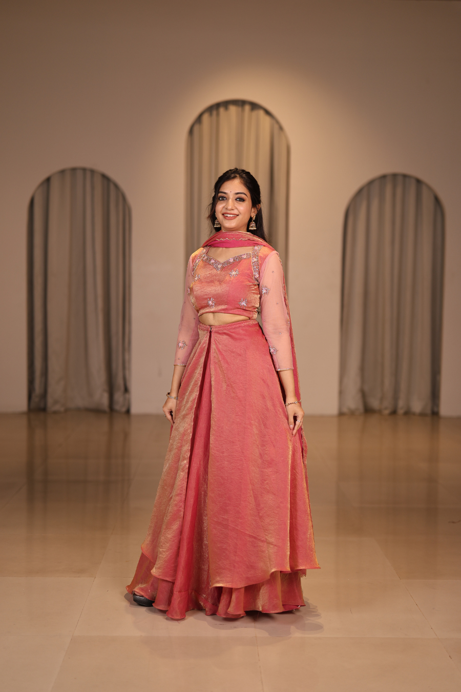 A blend of elegance and versatility, this 3-in-1 crushed space silk ensemble in a soft pink hue redefines festive dressing. The intricate Aari work on the neck and sleeves, paired with delicate net detailing, adds a touch of refined grace and glamour.
