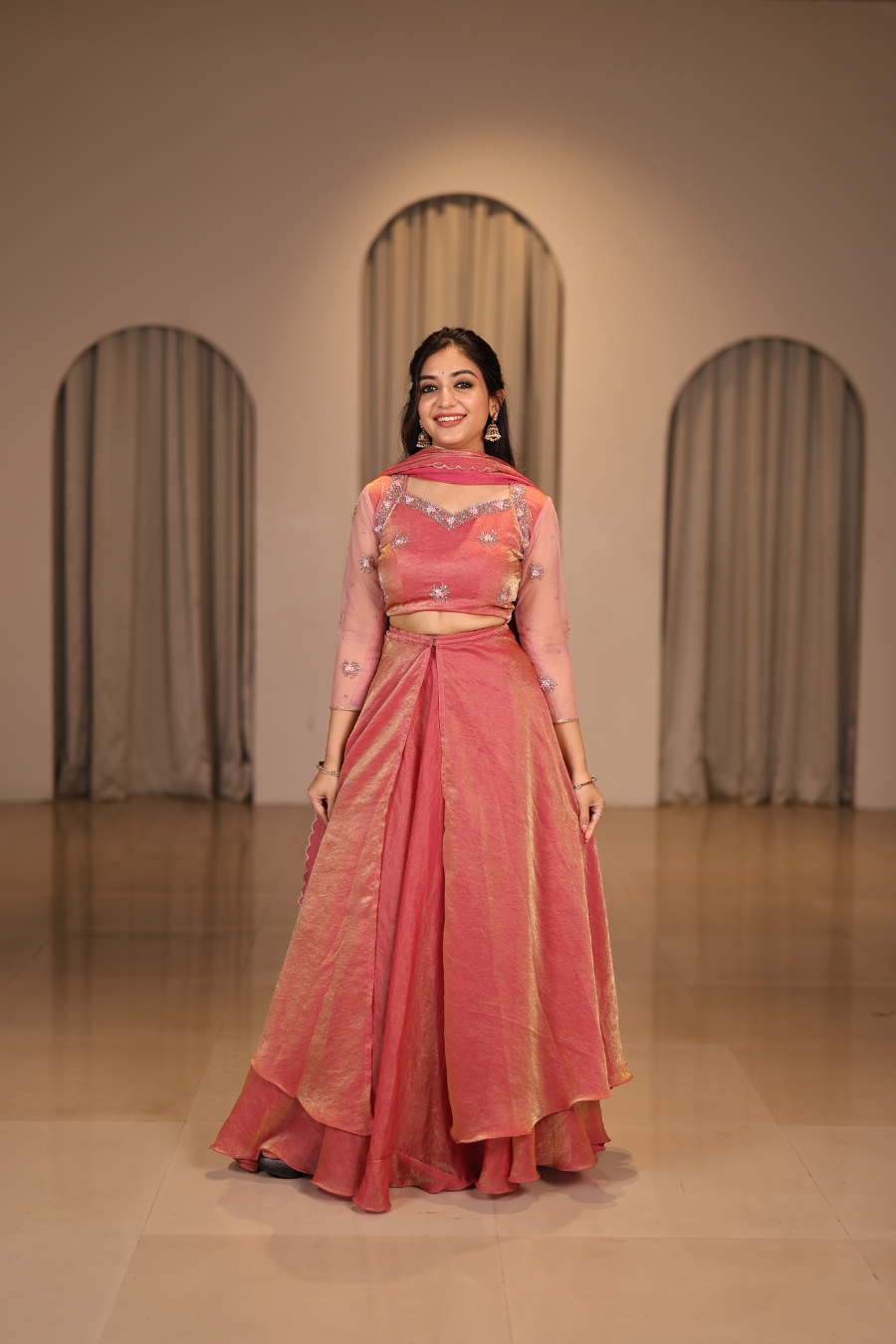 Designed for multiple looks, this set can be styled as a crop top with skirt, a crop top with peplum, or in a graceful drape pattern — perfect for weddings, receptions, and festive occasions.
