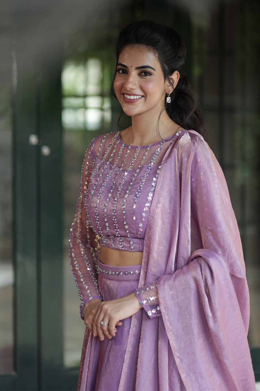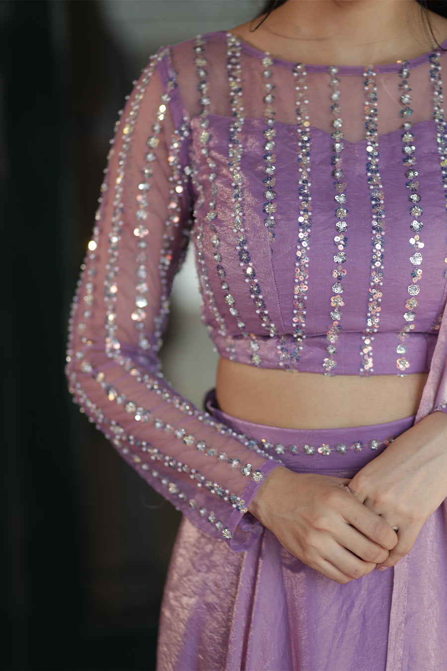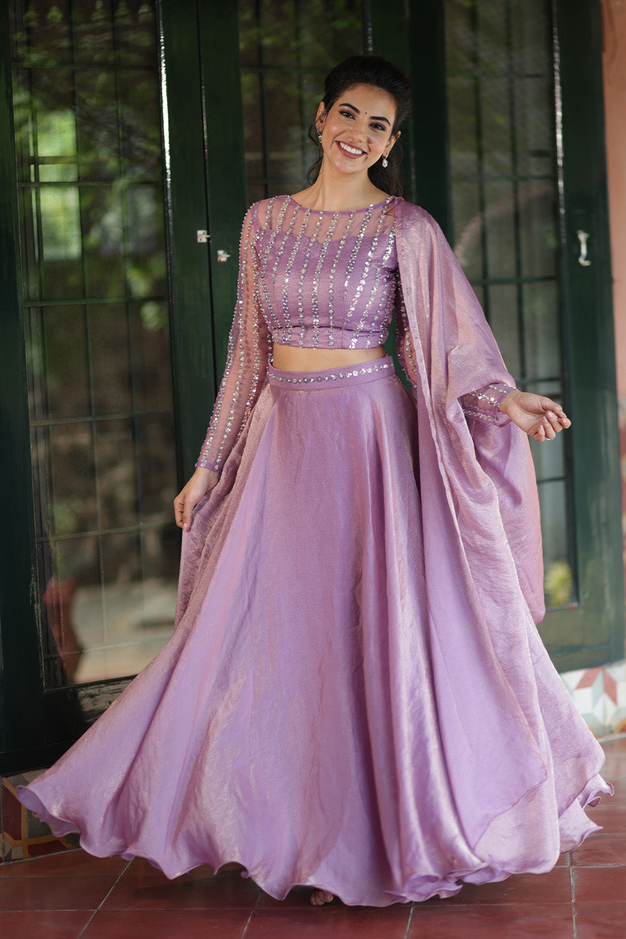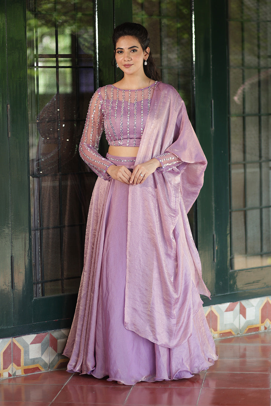 Lavender that speaks elegance — step into the spotlight in this ethereal lehenga set, where every bead is stitched with grace and every twirl celebrates beauty. Designed in feather-light space silk, the full-flare skirt, handcrafted beadwork blouse, and sheer dupatta create the perfect balance of tradition and modernity.