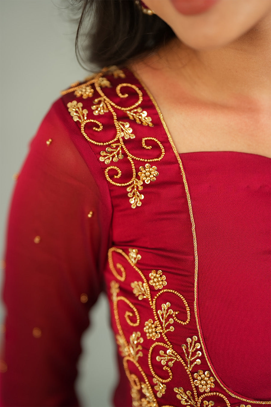 This peplum top and skirt set with intricate work is a beautiful, elegant combination that enhances a woman’s silhouette while showcasing exquisite craftsmanship.