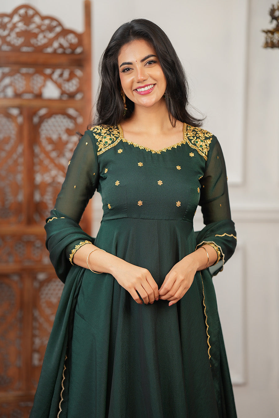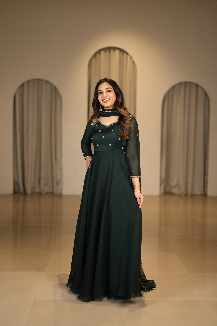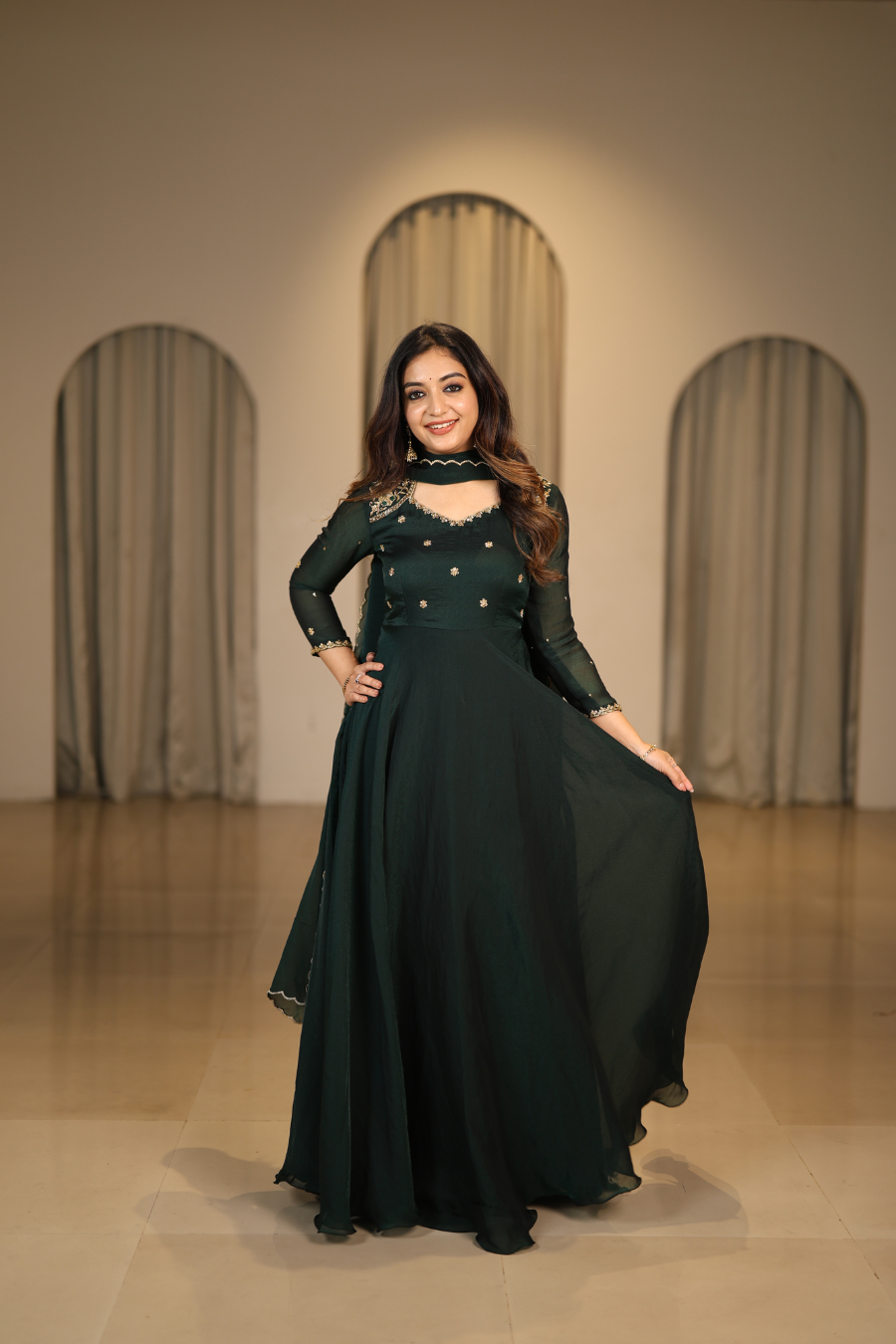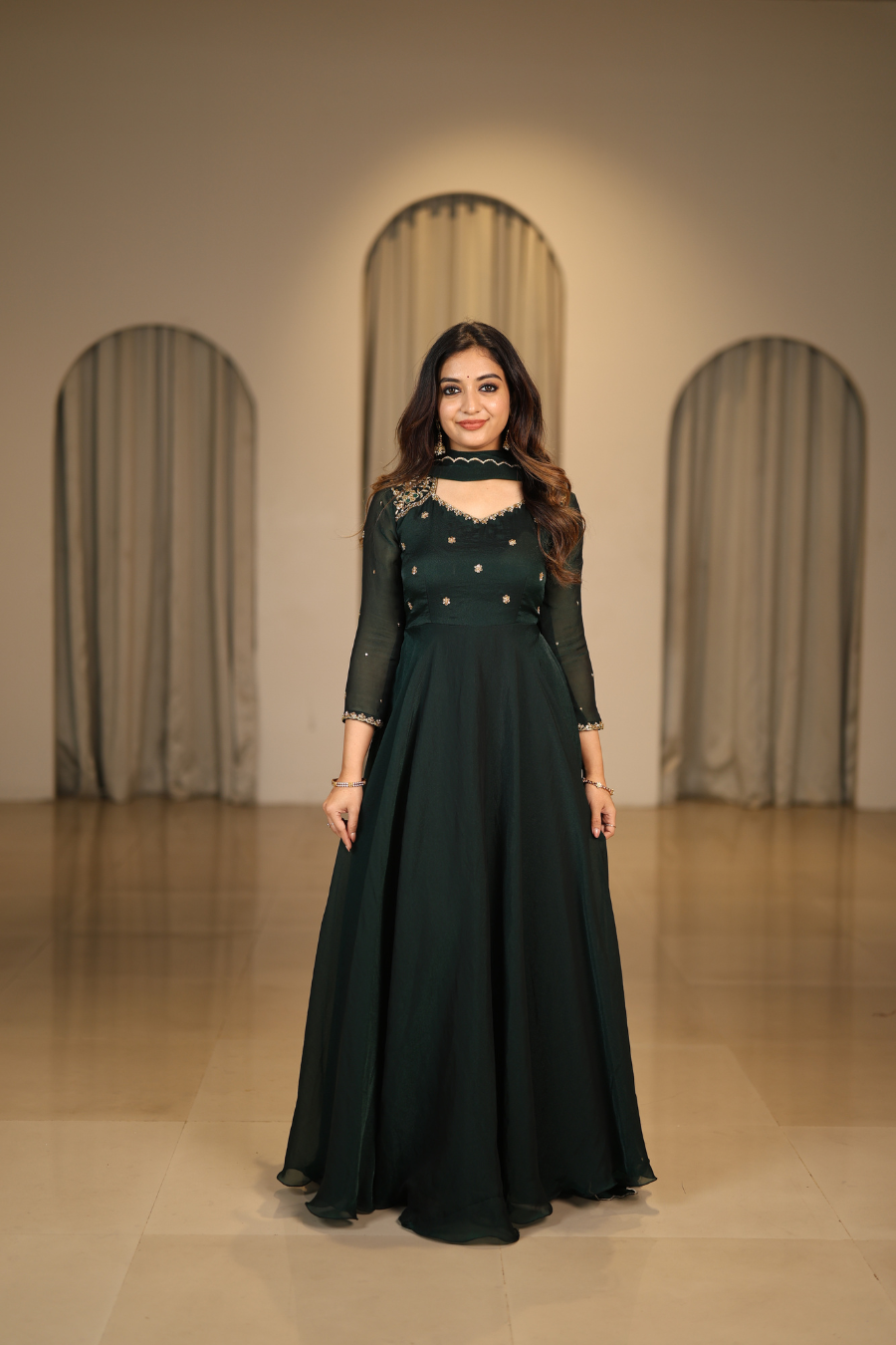 A timeless Anarkali crafted from luxurious silk georgette fabric. Designed with full flare for a regal silhouette, it exudes effortless elegance perfect for festive and traditional occasions.