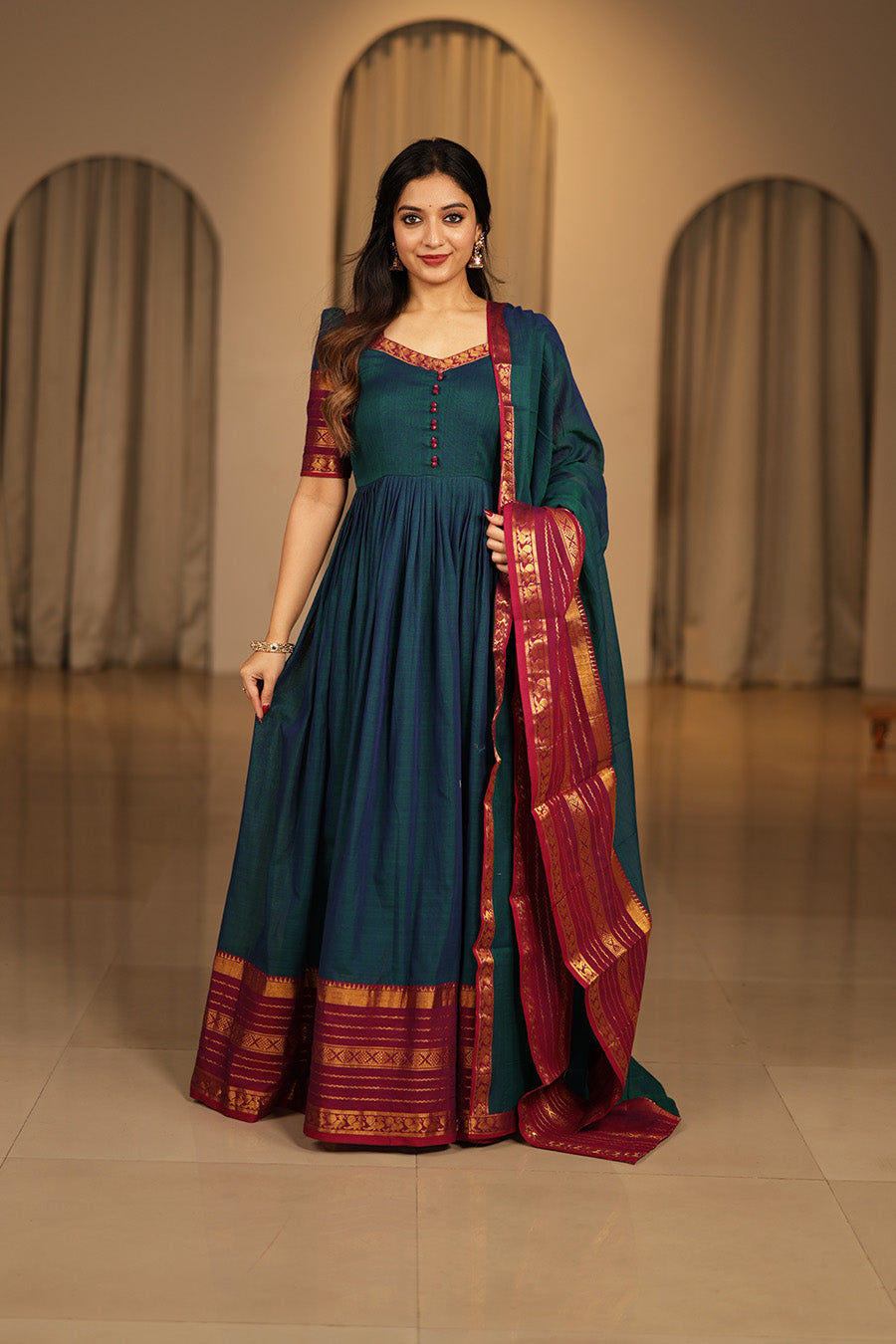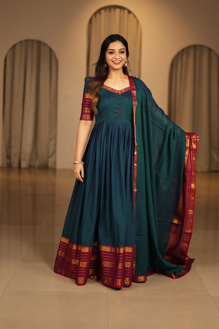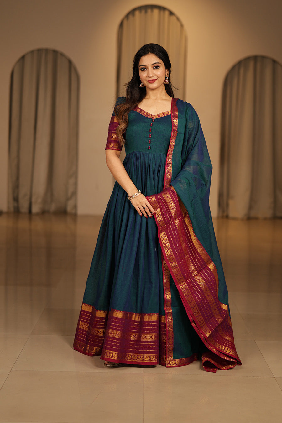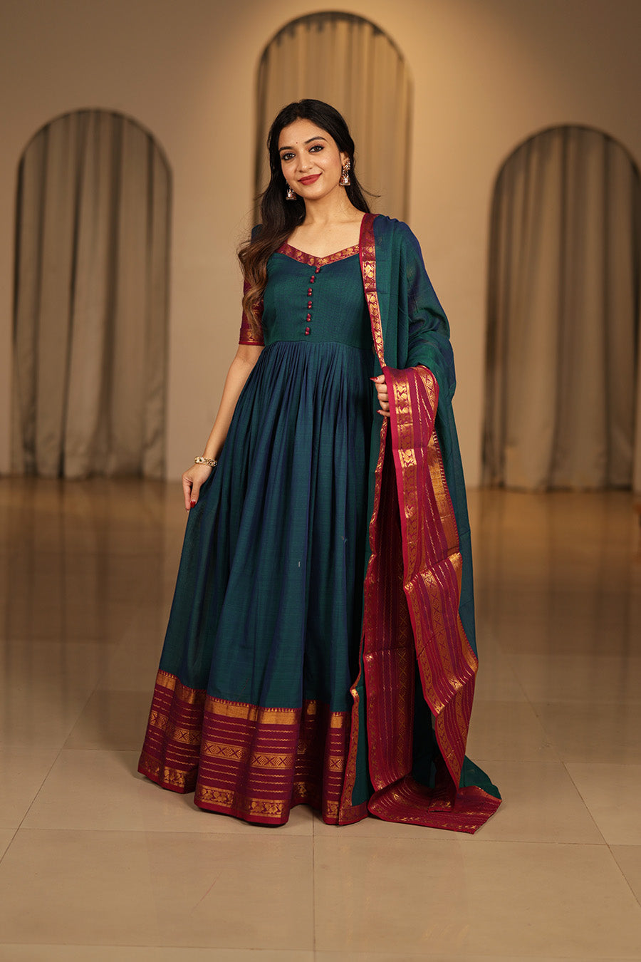 A classic Narayanpet-inspired Anarkali that blends traditional craftsmanship with graceful ethnic styling. The rich teal tone and flowing silhouette make it a timeless choice for festive and cultural occasions.