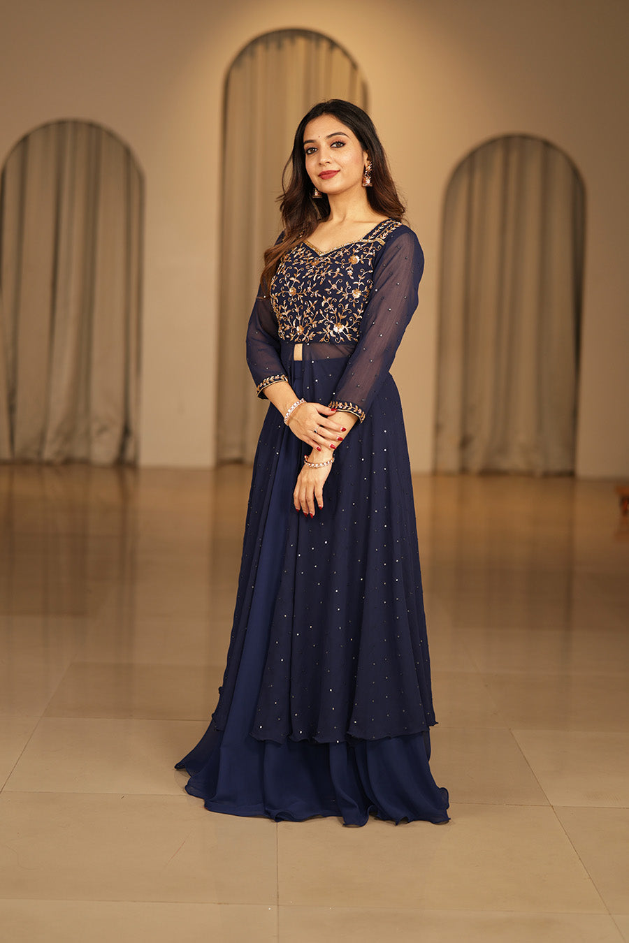The sequin-embellished peplum top adds a subtle shimmer, while the plain flowing skirt keeps the look refined and graceful—ideal for festive celebrations and evening occasions.