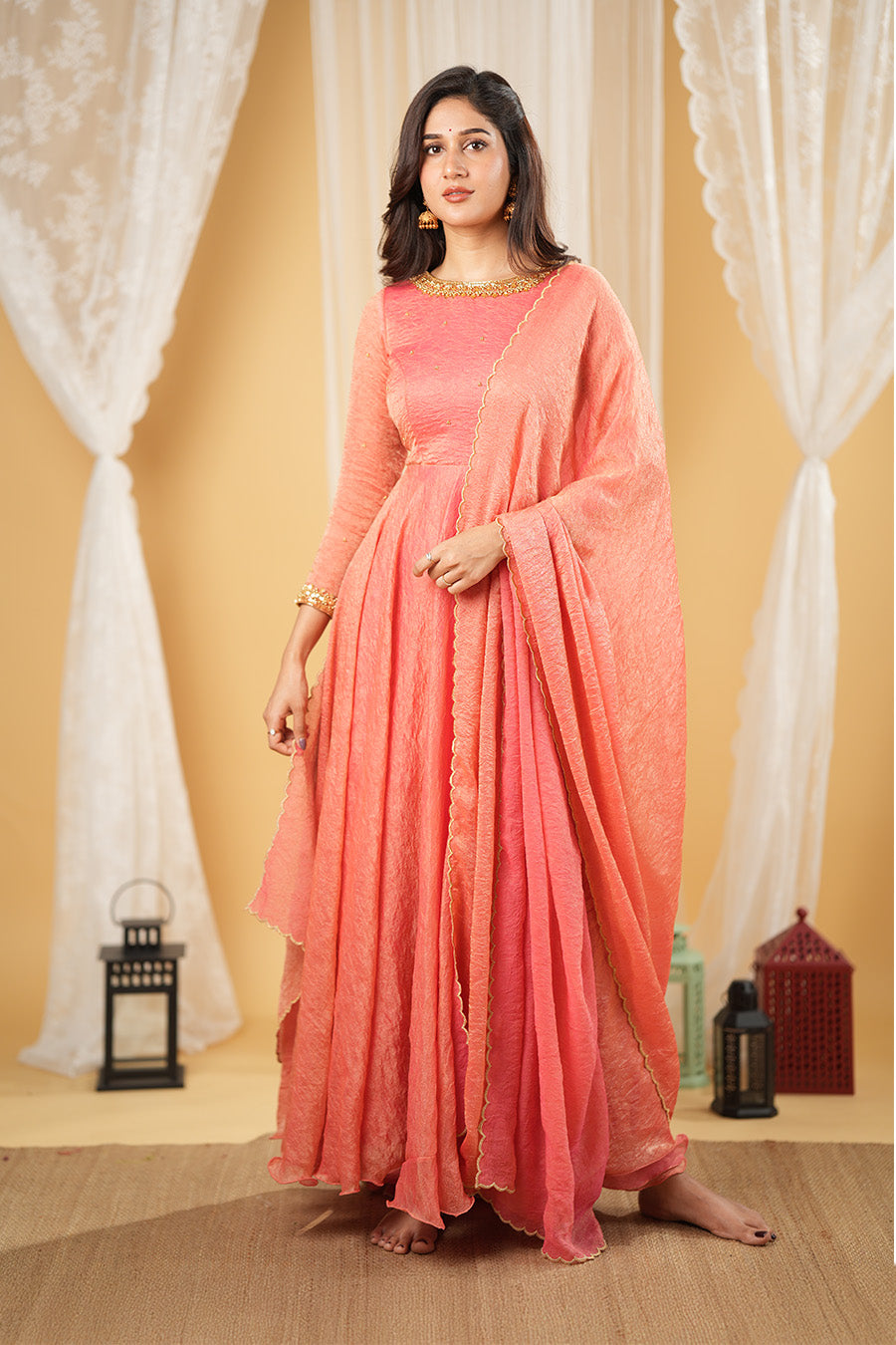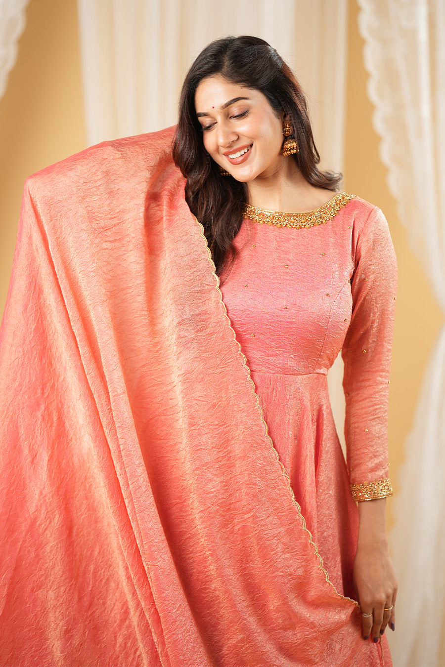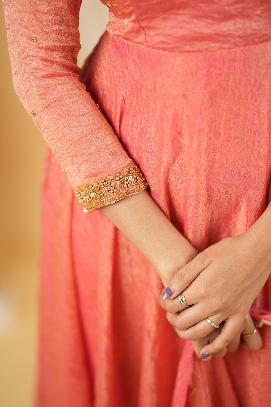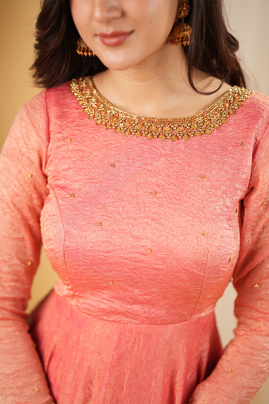 This crushed georgette dress, adorned with intricate Aari work, is a timeless blend of tradition and contemporary style.