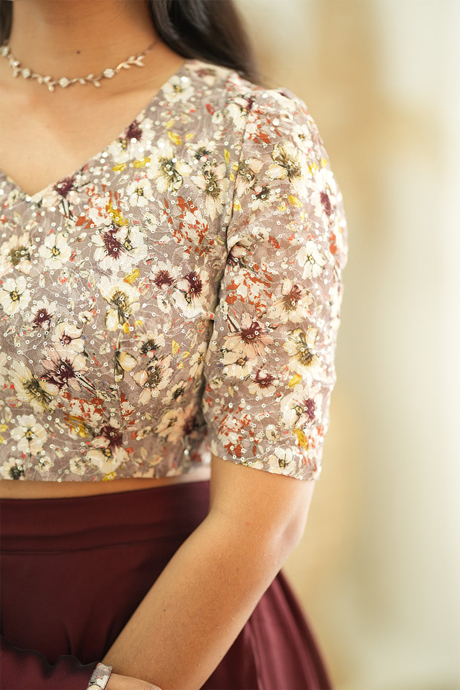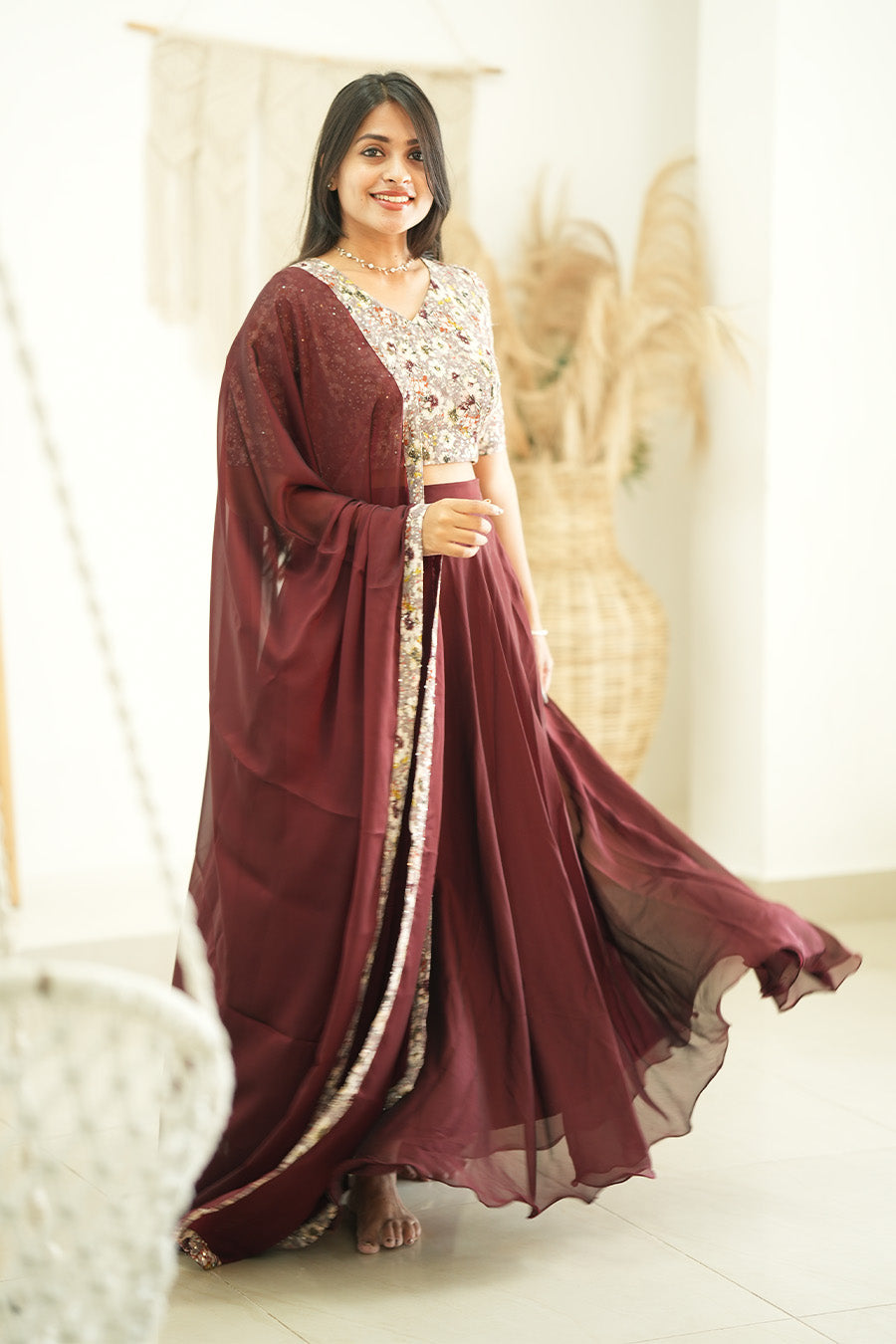 Designed with love and festive cheer, this dress features a luxurious blend of classic style and modern elegance. The sequin designer fabric used for the crop top and the glossy georgette skirt creates a soft, flowing movement — perfect for twirling under the mistletoe.