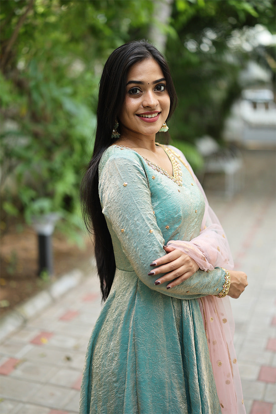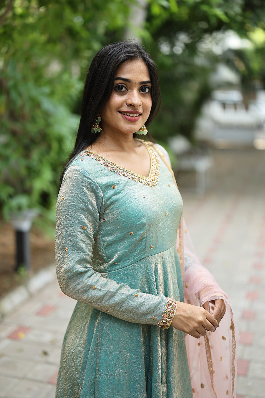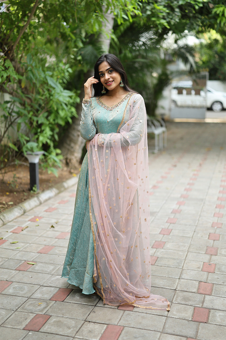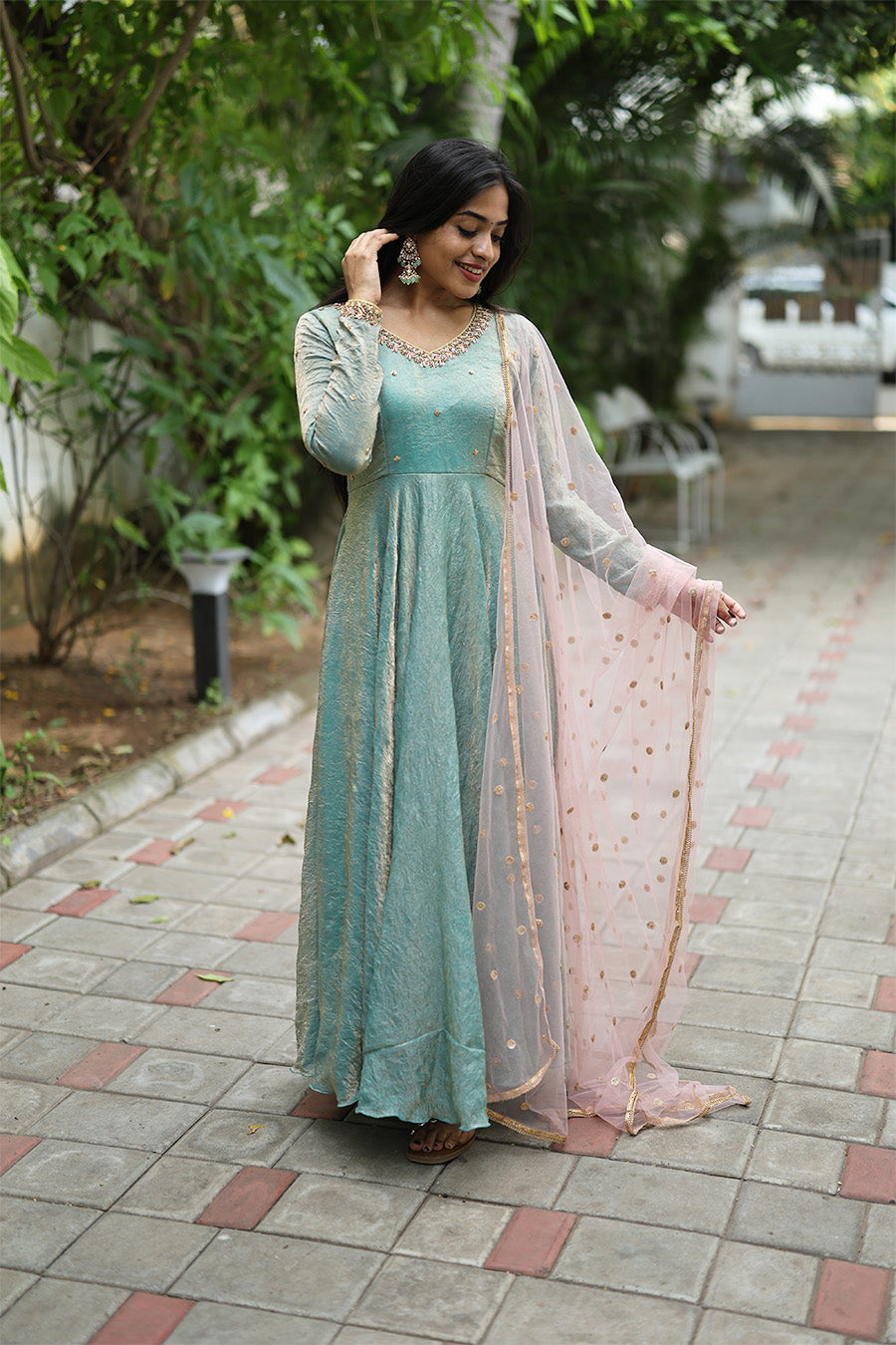 A timeless and graceful Anarkali set crafted from luxurious crushed space silk. Designed with a full flare silhouette and full sleeves, this outfit beautifully captures elegance and tradition in every detail.
