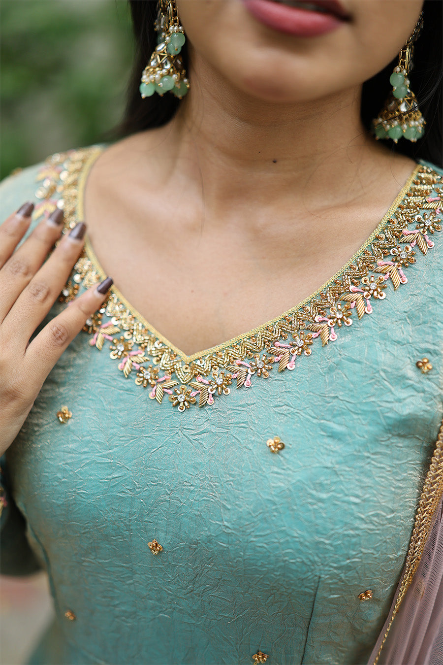The neckline and sleeves feature intricate Aari embroidery, adding rich texture and craftsmanship to the ensemble. Paired with a delicate netted dupatta adorned with lace borders, this look exudes refined charm — perfect for festive and celebratory occasions.