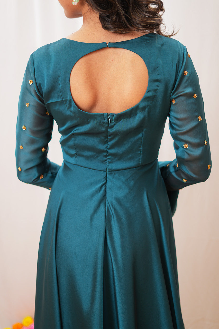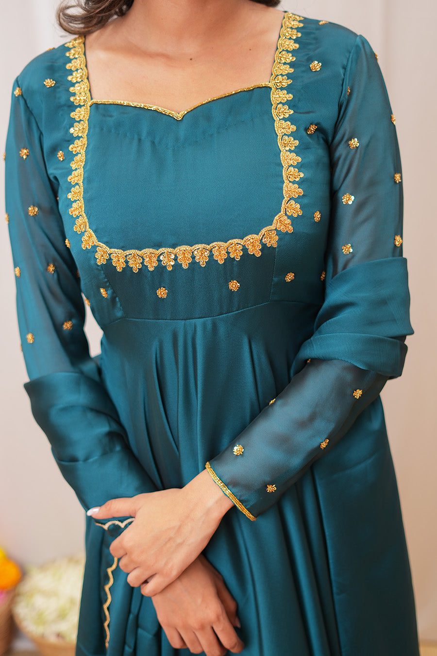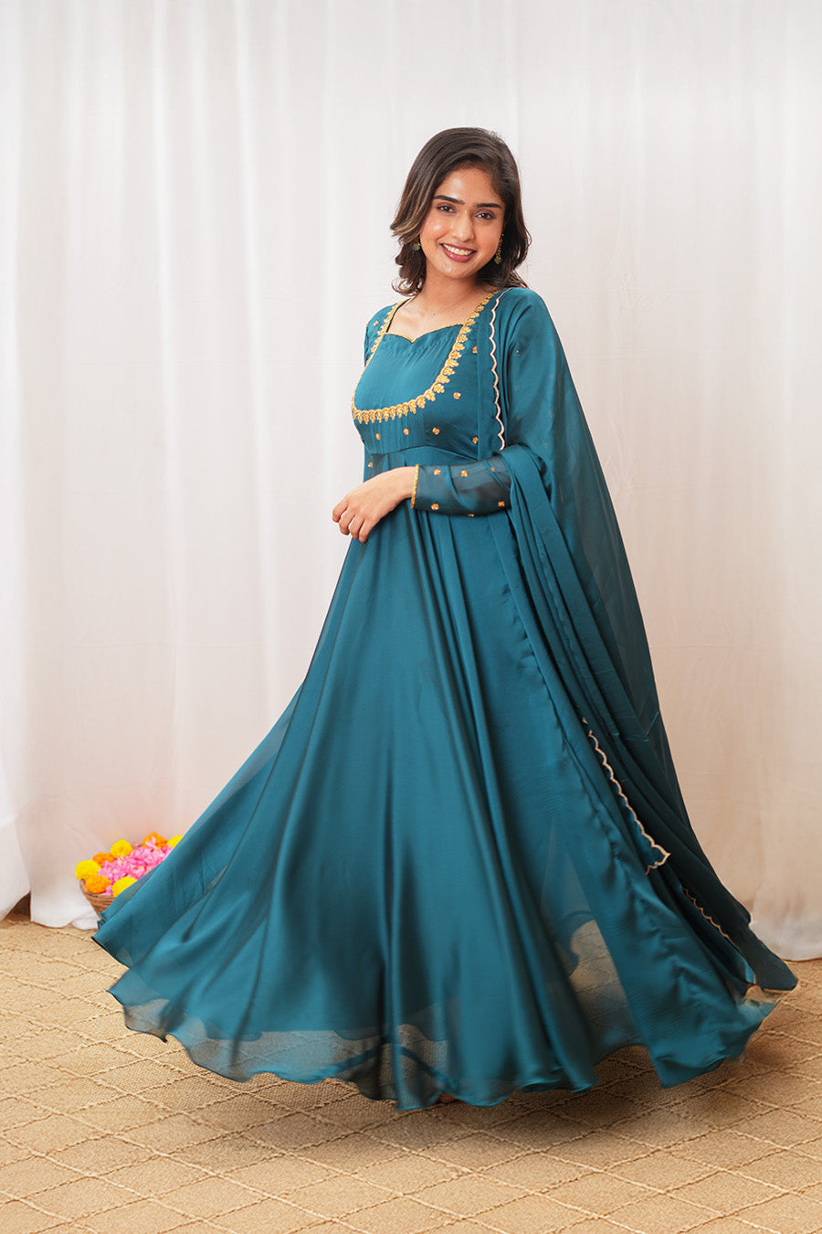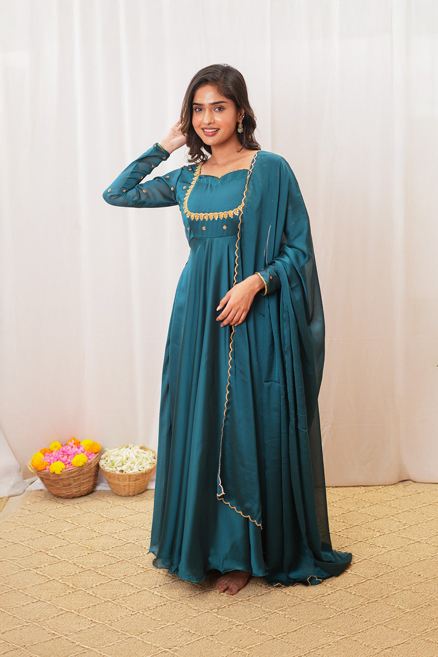 The neckline and sleeves are adorned with intricate Aari work, adding a touch of traditional elegance. Paired with a scalloped-edge dupatta, this teal Anarkali set is perfect for festive occasions and celebrations.