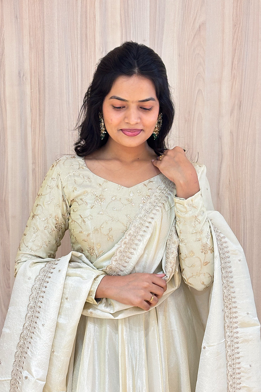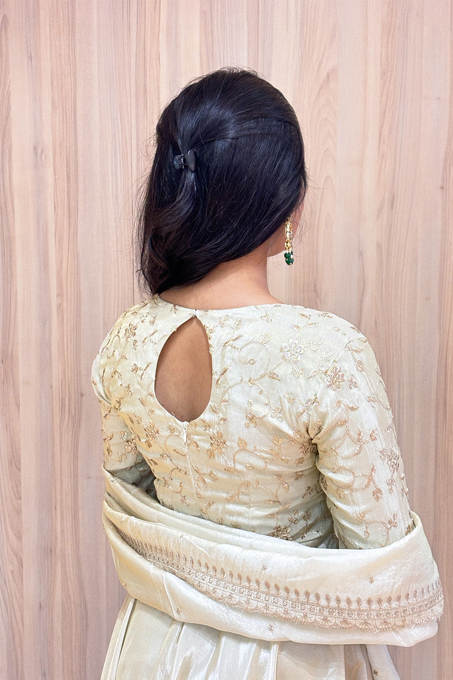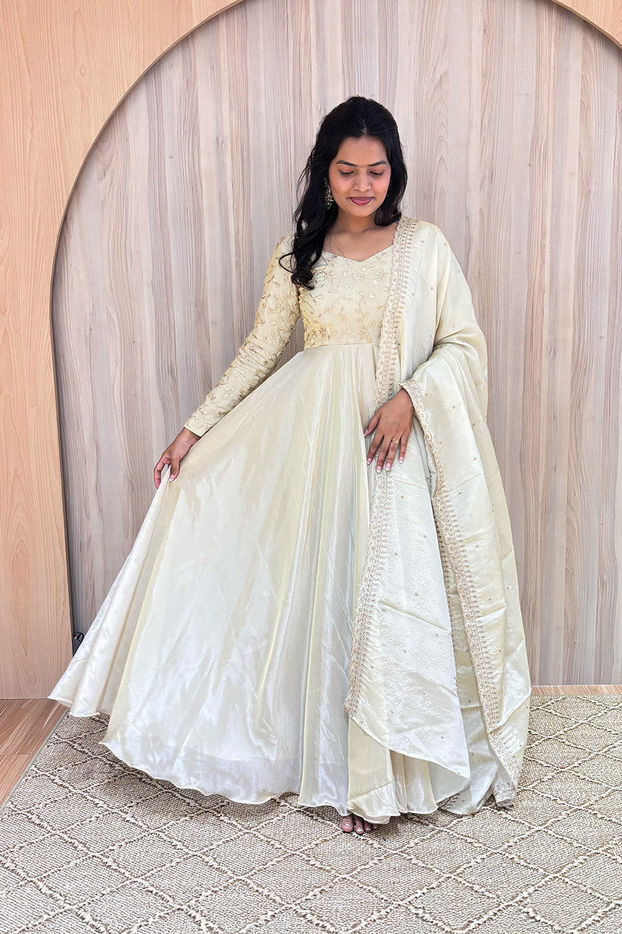 A timeless and elegant ensemble designed for graceful celebrations. Nila features a beautifully detailed thread work yoke that adds subtle richness to the look, paired with a flowy tissue bottom that enhances its regal silhouette.
