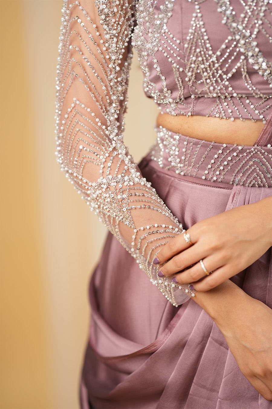 When timeless beauty meets intricate craftsmanship… This drape dress is a perfect blend of sophistication and modern charm. The ethereal yoke and sleeves, adorned with delicate pearl work, perfectly complement the graceful flow and shimmering glow of the skirt. ✨✨
