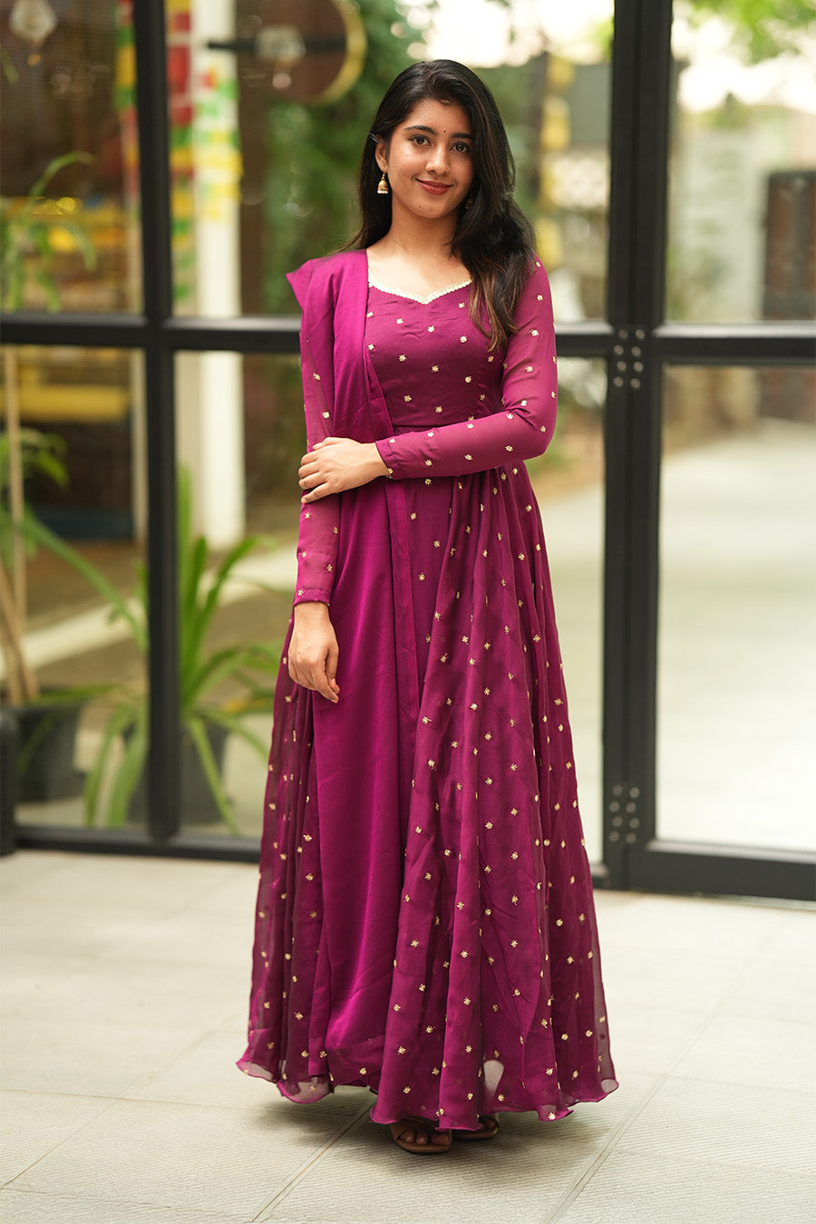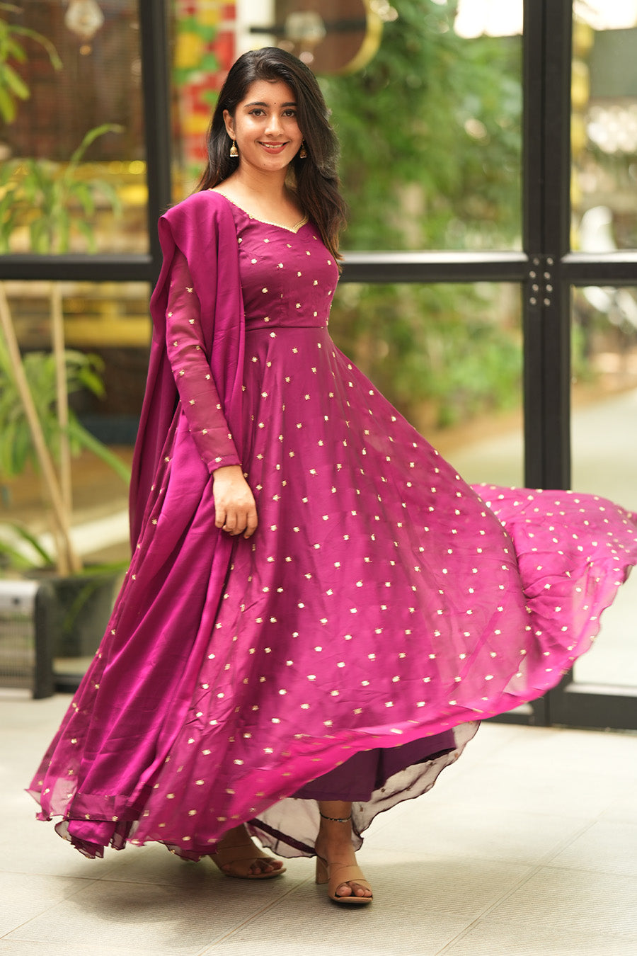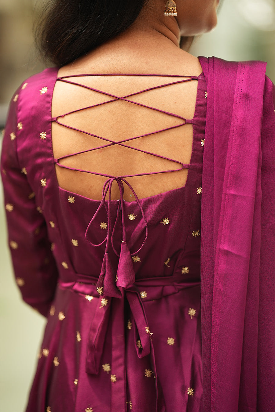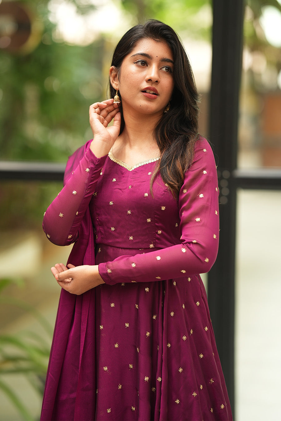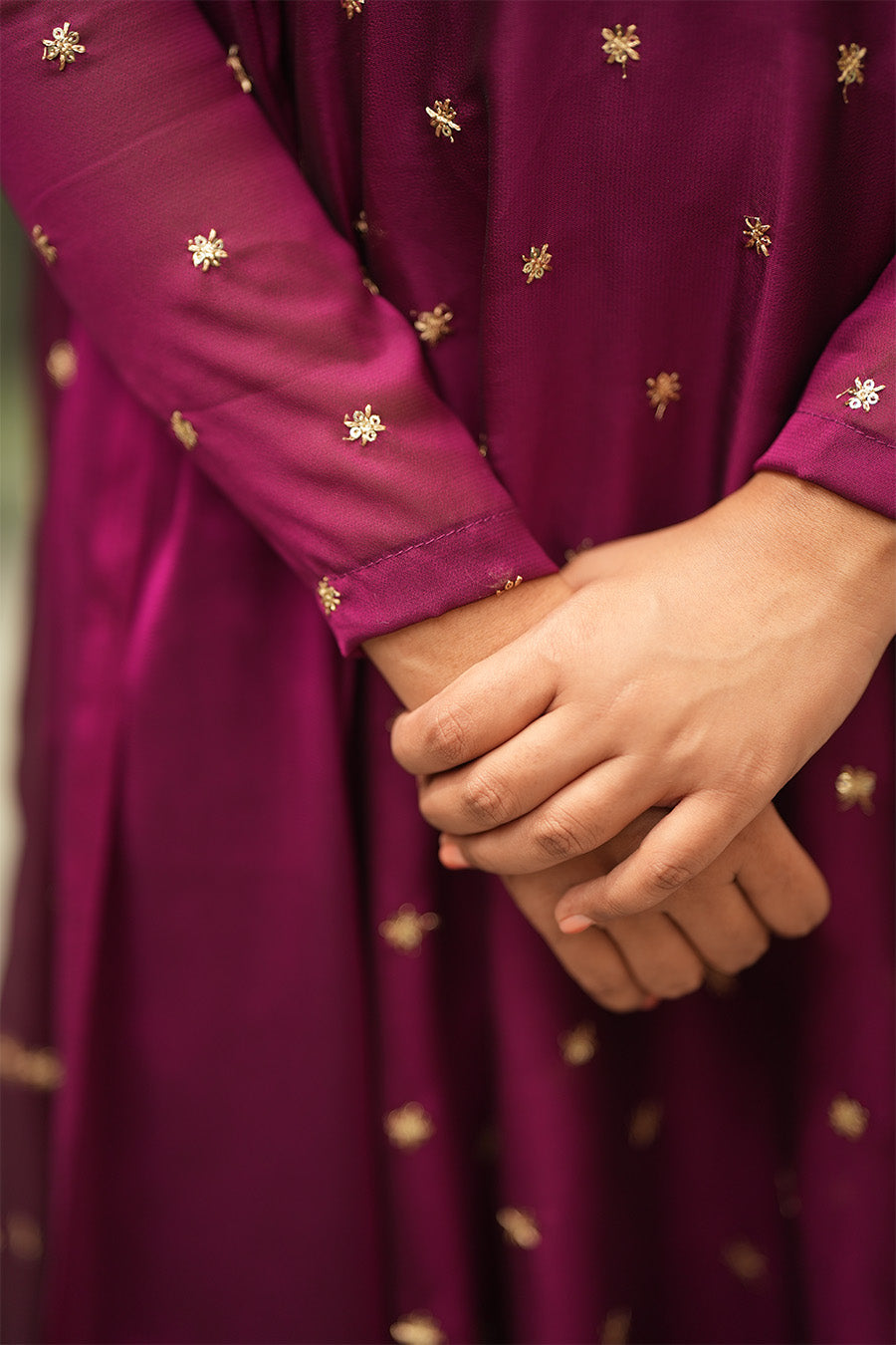 This wine-purple Anarkali set is designed to make you shine effortlessly at every occasion. Featuring delicate golden sequin butties all over, the flowy georgette silhouette moves with grace, while the full sleeves add a touch of sophistication.