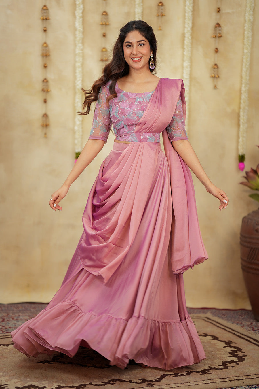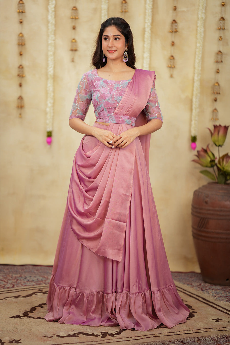 Grace and charm come alive with the Prisha Collection in a soft mauve pink hue. Designed in flowing fabric with a layered drape, this ensemble adds a dreamy elegance to your festive look.