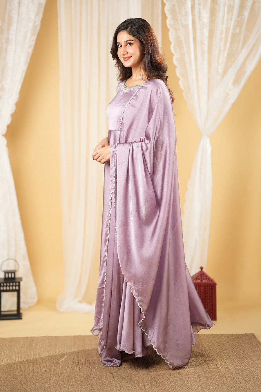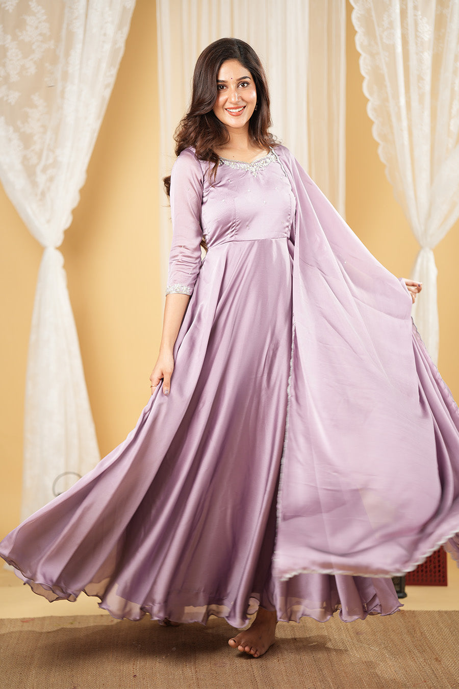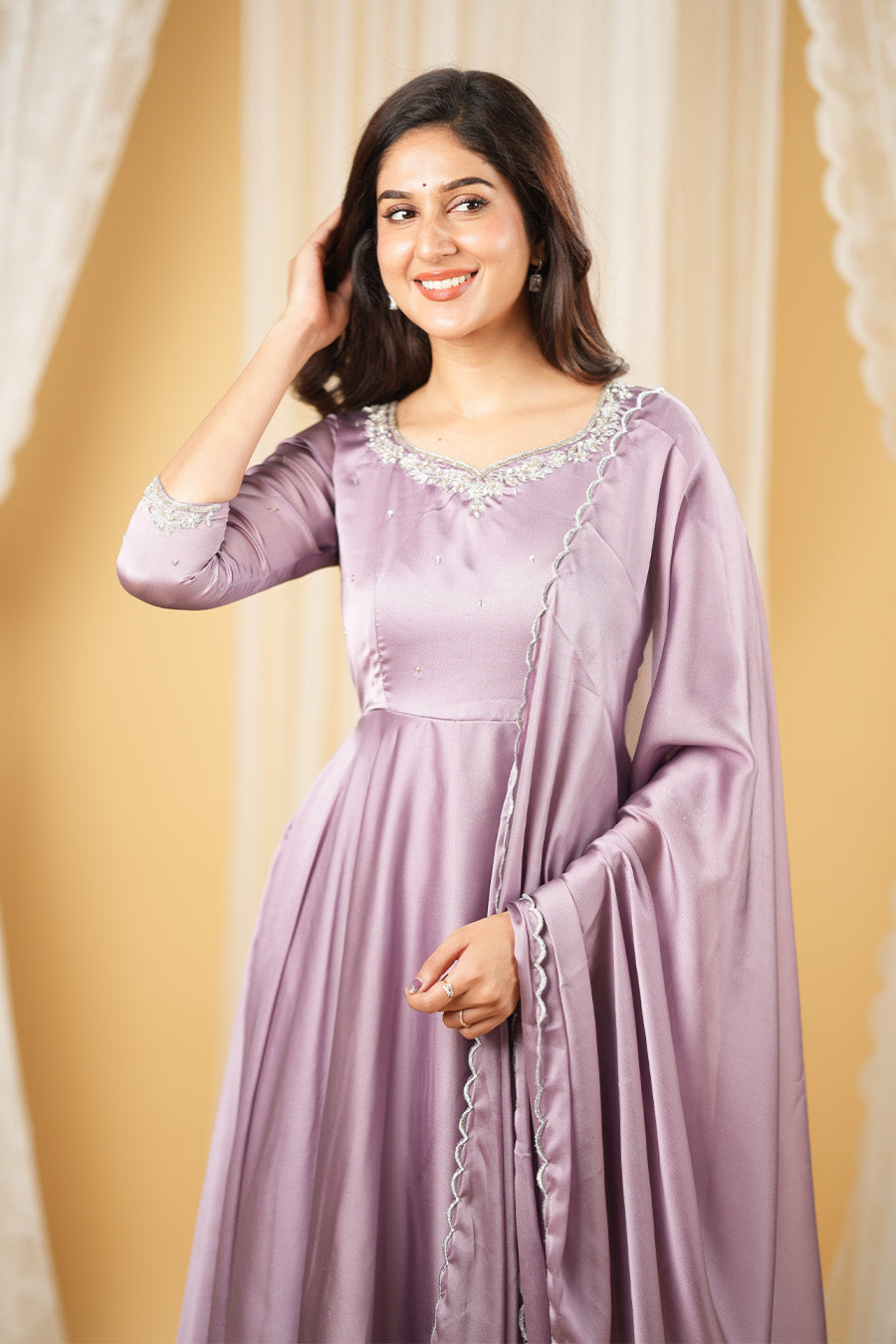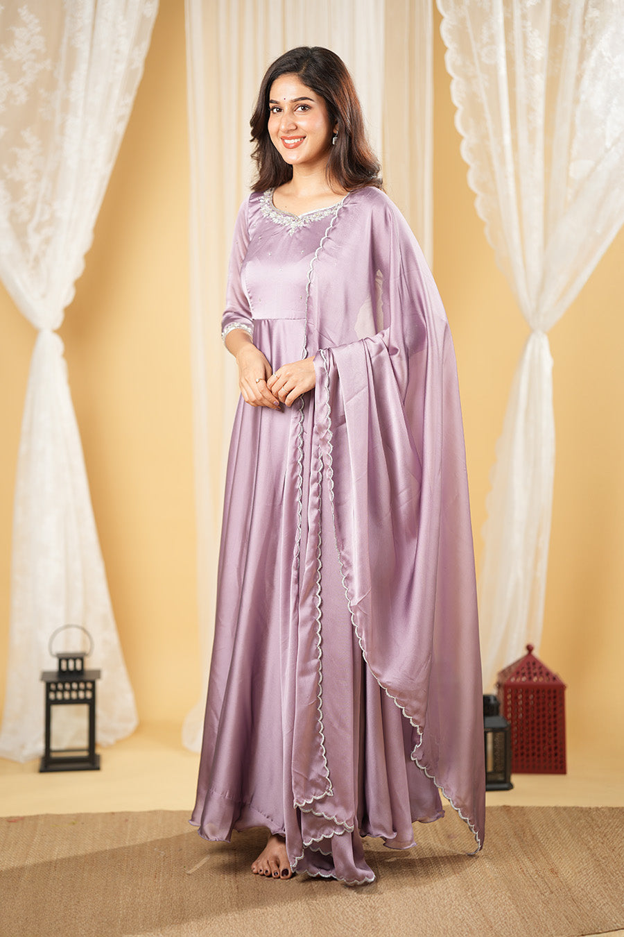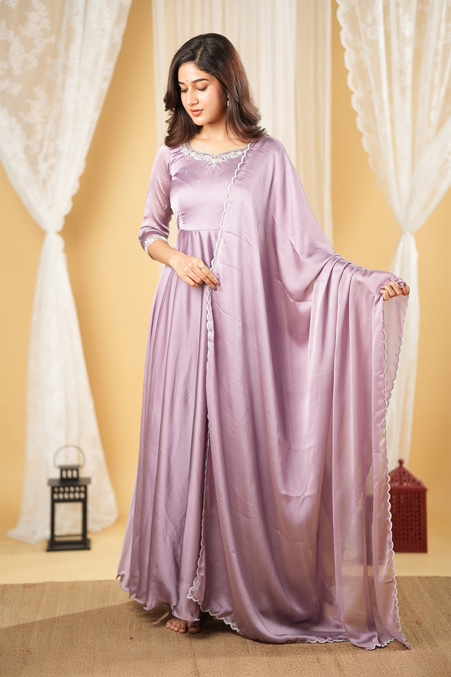 Designer Anarkali with intricate Aari work on the neck and sleeves, paired with a glamorous double flair bottom and a delicately scalloped dupatta.