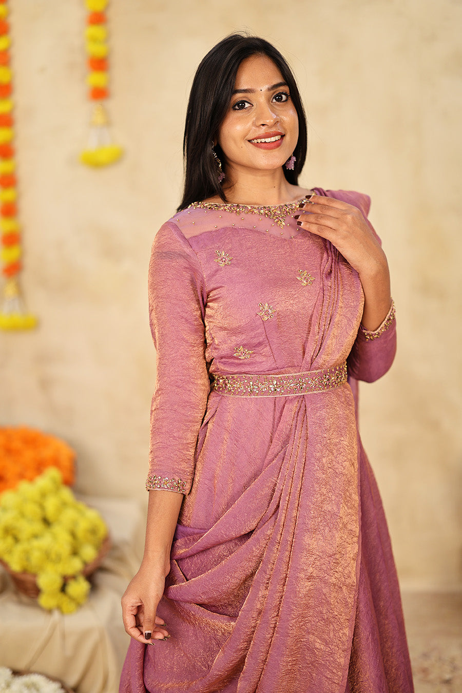 An elegant drape dress crafted from premium crushed space silk, designed to flow gracefully with a full-flare silhouette and 3/4th sleeves. This dress combines festive charm with timeless sophistication, making it a must-have for special occasions.