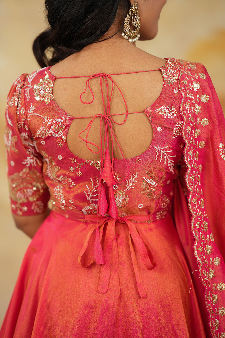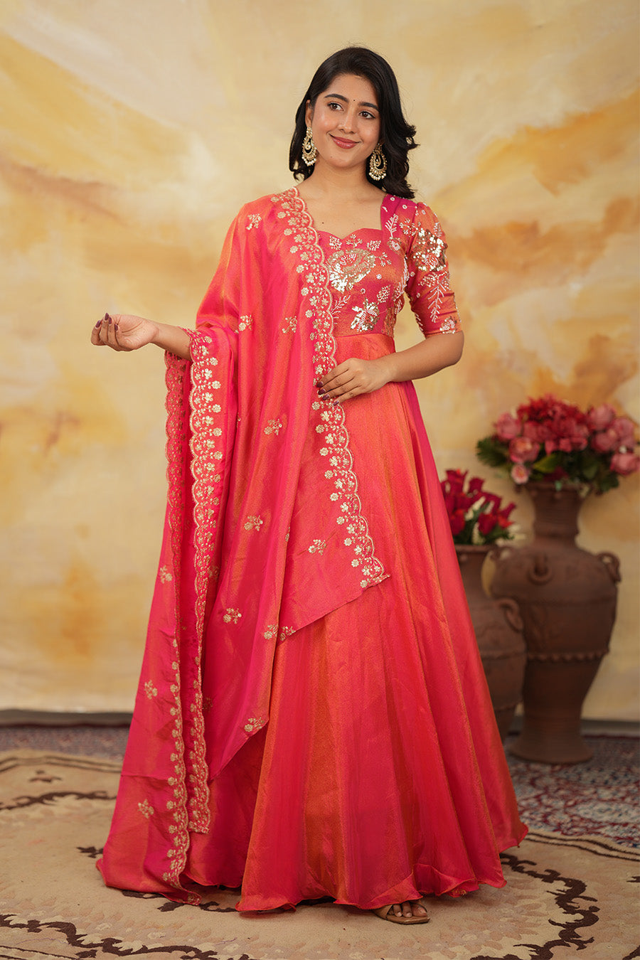The Samaira Ensemble is a radiant blend of festive flair and refined elegance. This striking lehenga set features a luxurious silk base in sunset pink and orange tones, intricately embroidered with floral motifs that shimmer with every step.
