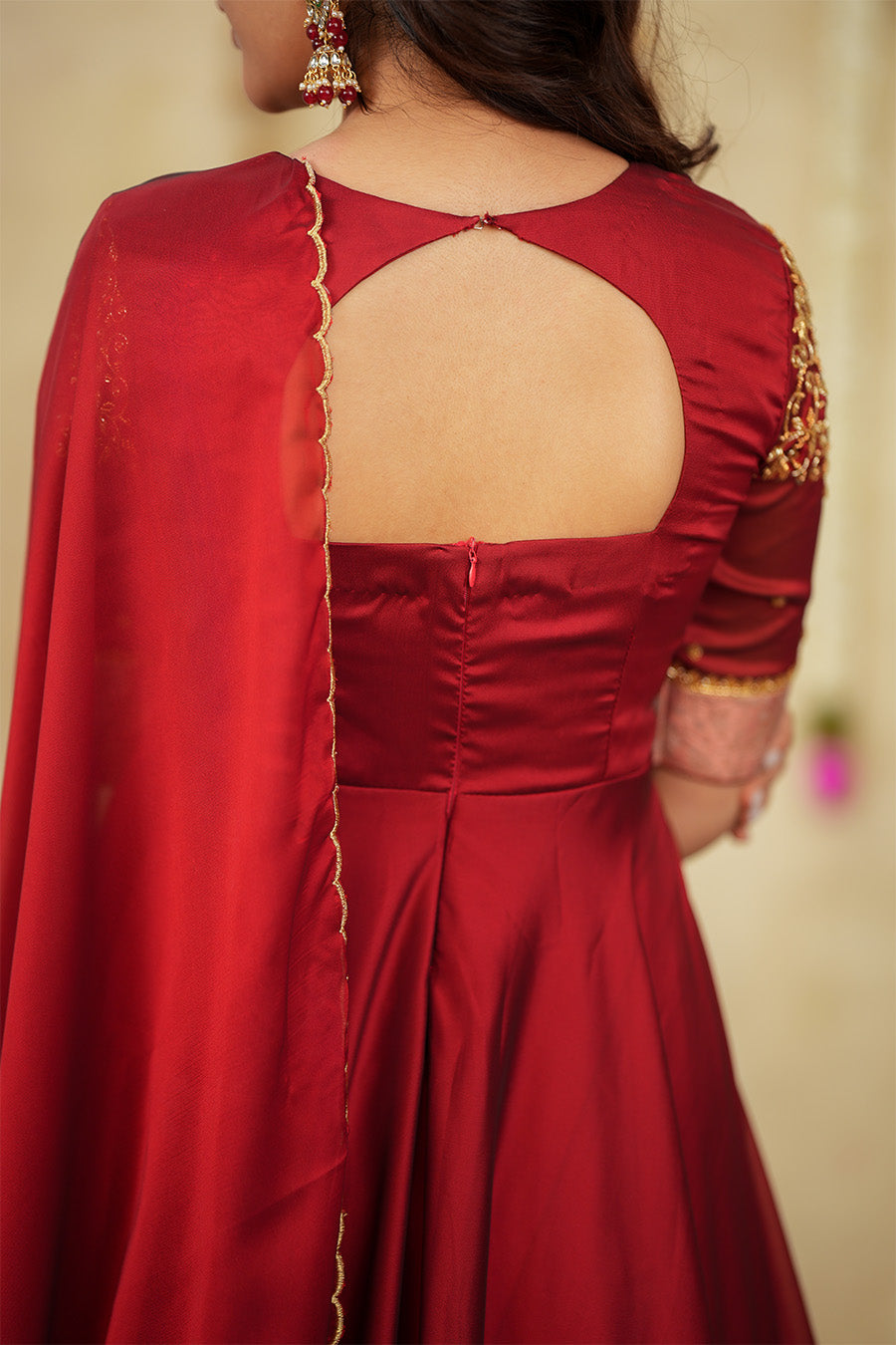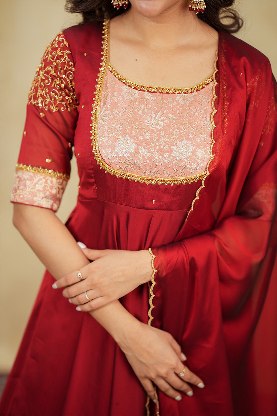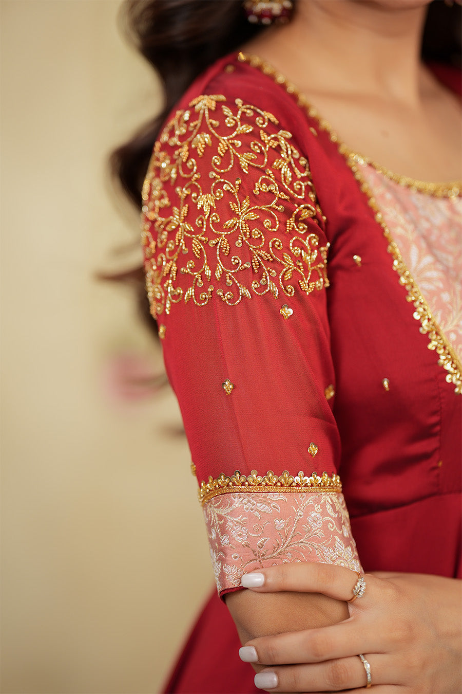 💫 Crafted in rich Banaras fabric, highlighted with intricate Aari handwork on the yoke and sleeves, this designer Anarkali is pure sophistication. The double flair silhouette and scalloped golden-thread dupatta make it a timeless show-stopper – perfect for weddings, sangeeths, festive occasions, or glamorous evenings.