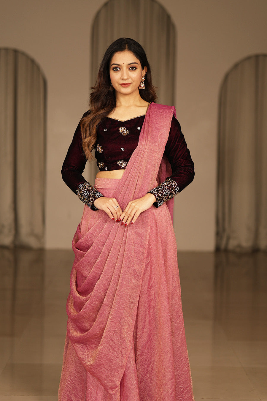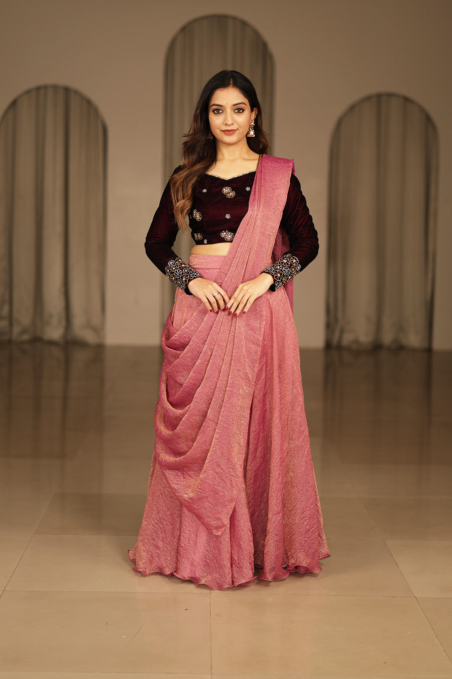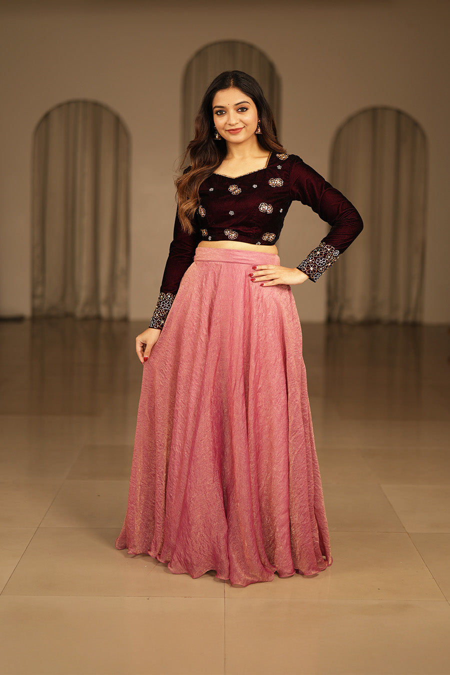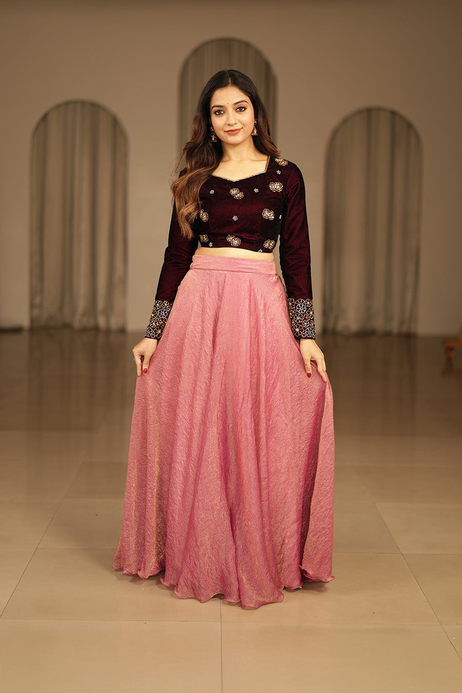 A graceful lehenga set designed to balance richness and elegance, featuring a structured velvet blouse paired with a beautifully flowing skirt. The refined silhouette offers a timeless festive appeal with a modern ethnic touch.