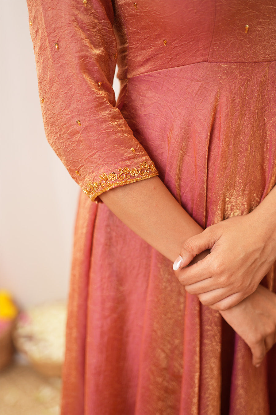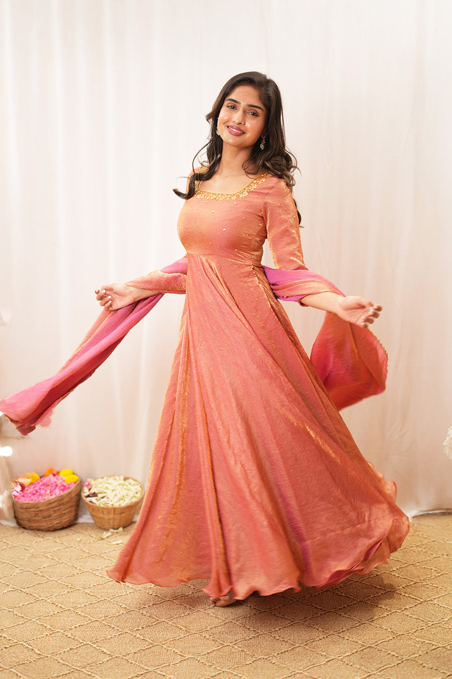 Vamika is a beautifully designed Anarkali set that blends traditional craftsmanship with elegant flow. Crafted in soft crushed georgette, this outfit offers a graceful silhouette perfect for festive and special occasions.