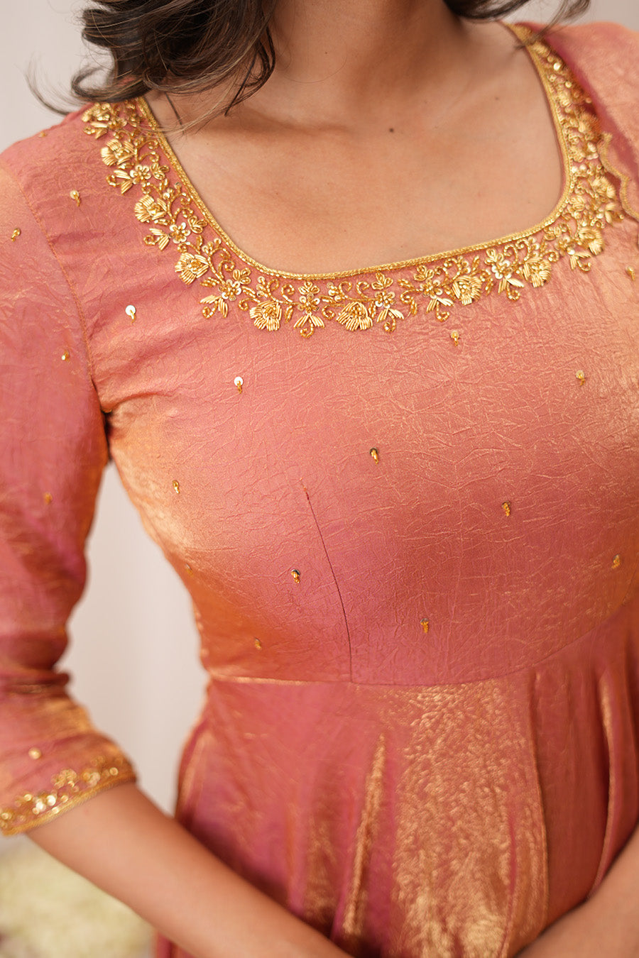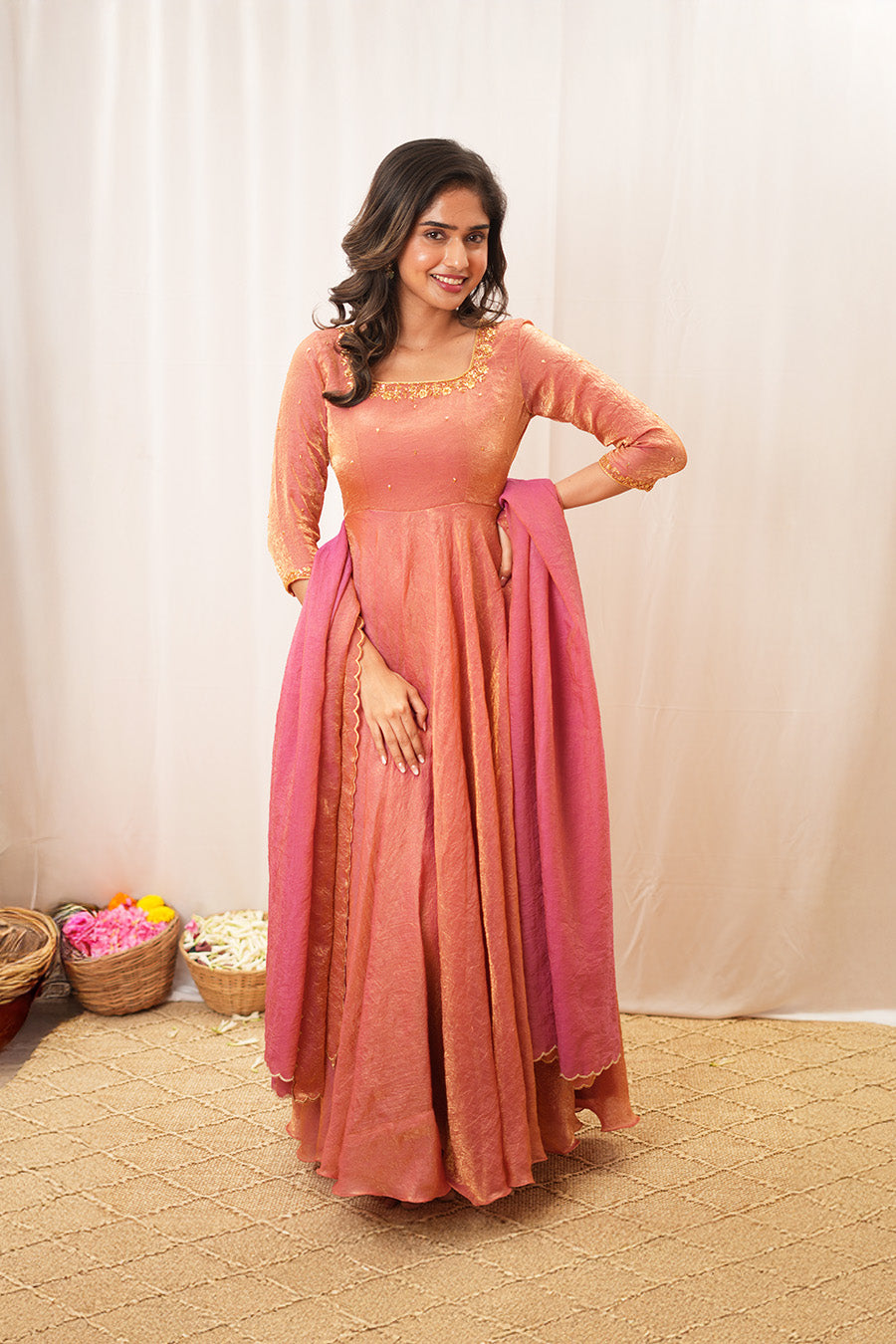 The neckline and sleeves are adorned with intricate Aari work, adding rich detailing and a refined finish. The flowing Anarkali is paired with a scalloped dupatta that enhances the overall charm and completes the sophisticated look.