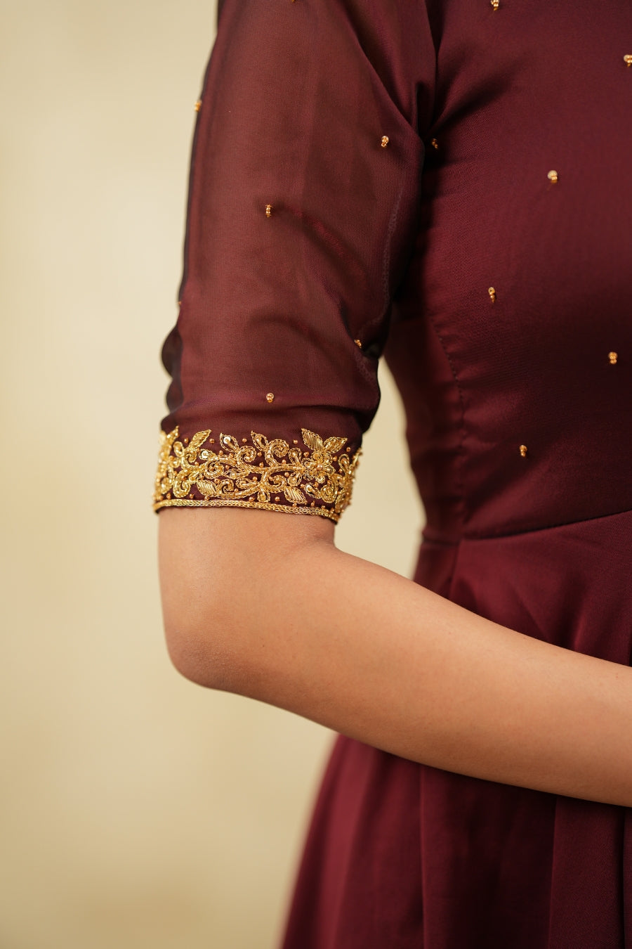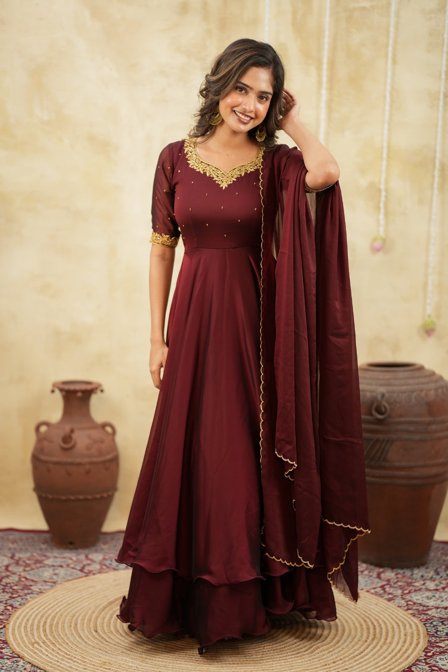 The Vedika Collection embodies regal charm in a deep maroon shade. Crafted with a velvet-inspired finish and enhanced with subtle golden detailing, this ensemble radiates timeless sophistication.